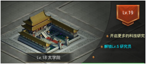 科技是一切的根本,它可以让你建造加速、士兵攻击变强、资源产量提升还有许许多多的功能,所以除官府外下一个升级目标就是他,至于研究项目建议以统帅力、点兵术、士兵攻击(x兵宣誓)为第一优先,不论是刷副本、打流寇甚至是打其他玩家抢资源,战力都是重要的,其余资源产量、招募速度、资源保护等都可以比较晚再研究。